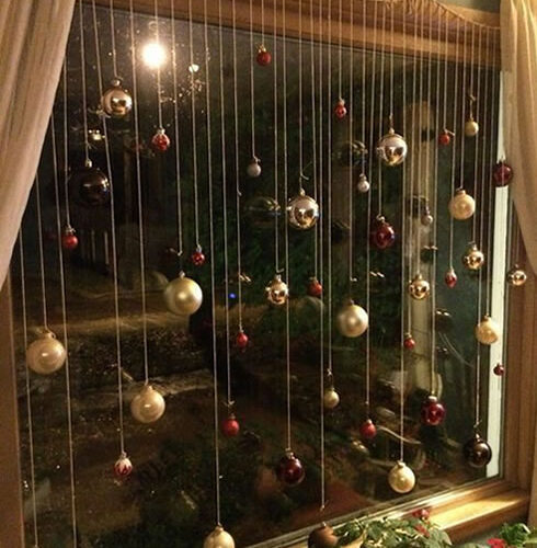 La mise en pratique de ces idées est très simple : attachez simplement toutes les boules de Noël avec du ruban ou de la ficelle, ou utilisez des bandes de tulle ou de perles pour les accrocher à une fenêtre ou à un cadre de porte.