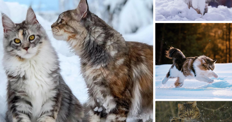 Témoignez du spectacle majestueux des chats perchés sur des surfaces élevées, observant leur domaine enneigé. Que ce soit au sommet de clôtures ou d’arbres, ces poses royales ajoutent une touche d’élégance à leurs aventures hivernales.