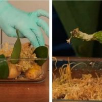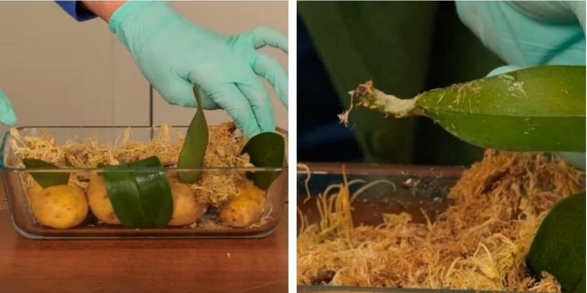 Les orchidées peuvent également être propagées par les feuilles. Vous pouvez essayer de les enraciner dans une pomme de terre, en faisant des incisions à l’intérieur. Les pommes de terre contiennent de l’amidon et suffisamment d’humidité pour nourrir et stimuler l’enracinement. Couvrir les pommes de terre de tous les côtés avec de la mousse de sphaigne trempée dans l’eau. Pour que les feuilles prennent racine, cela prendra un certain temps (10-14 jours). Il reste à attendre.