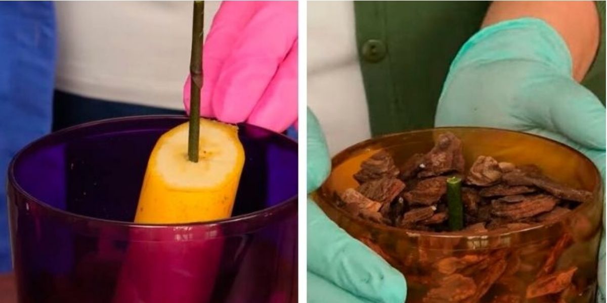 Dans ce cas, l’argument est similaire : la banane possède une valeur nutritionnelle élevée et suffisamment d’humidité pour enraciner une tige florale. Coupez les bananes en deux et insérez la tige en l’entourant de mousse de sphaigne humide. Pendant 14 à 20 jours (cela peut prendre plus de temps), transplantez la tige enracinée dans un pot avec un substrat pour orchidées.