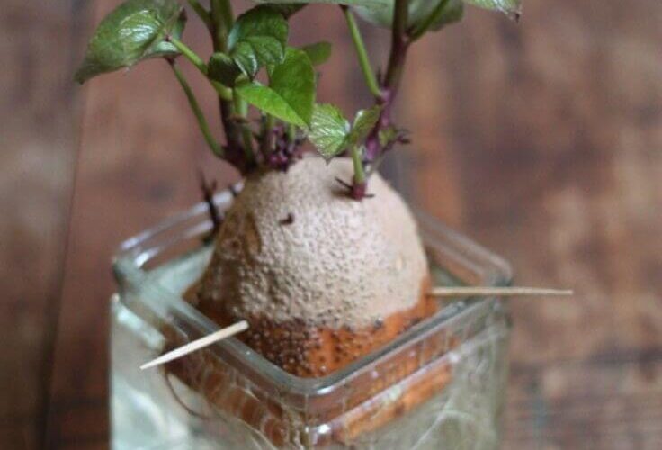 Pour réussir à faire pousser des patates douces par le haut, coupez le dessus et piquez quelques cure-dents. Suspendez-le ensuite dans un verre rempli d’eau là où la partie inférieure entre en contact avec l’eau. Placez-le à la lumière indirecte, les racines se formeront en 2 à 4 semaines.