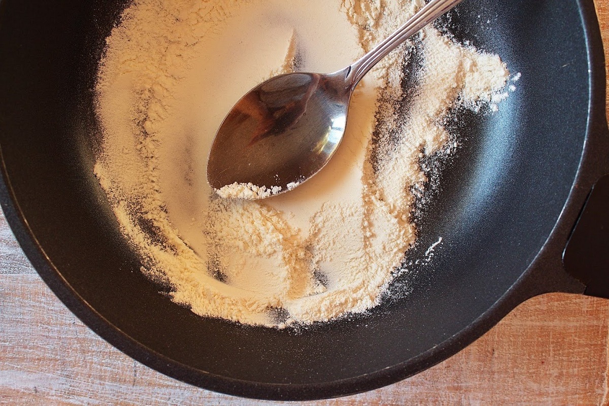 1.Faire frire la farine sur une poêle sèche.