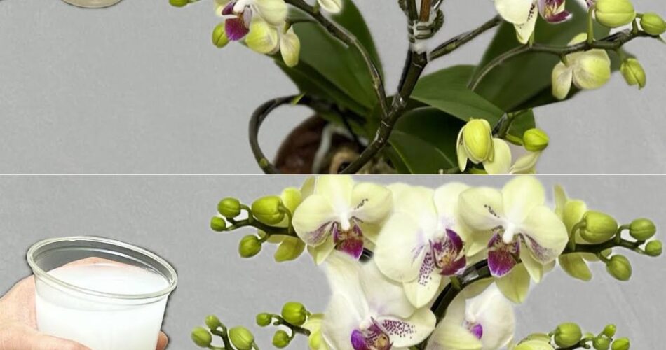 Bien sûr! Voici une version catchy en français : Je verse ceci aux racines ! Instantanément, l’orchidée fleurit tout au long de l’année