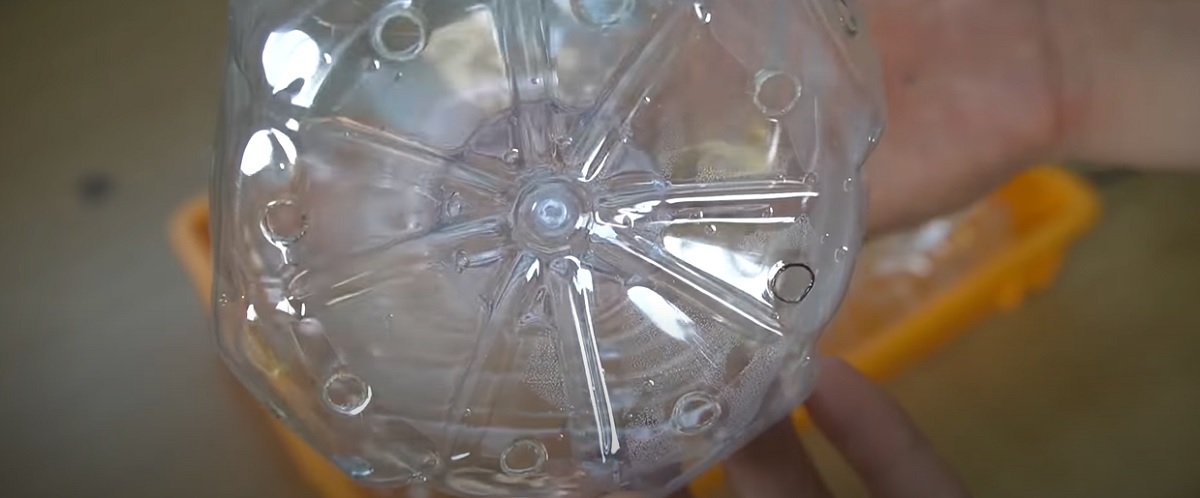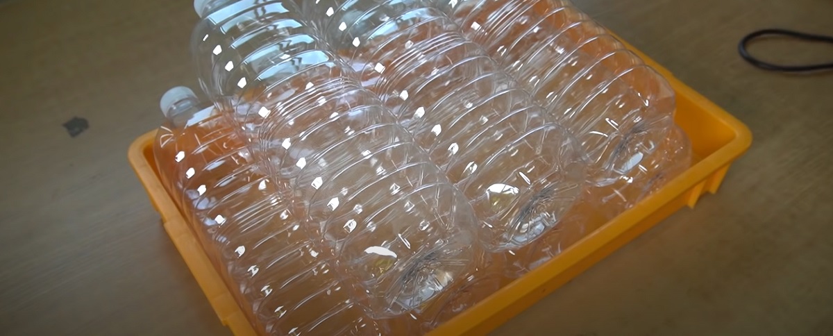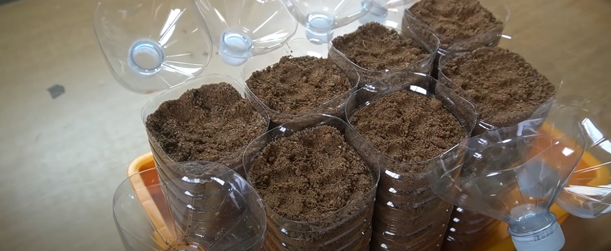 8.Acoperiți substratul cu părțile superioare ale sticlelor. Ca să nu se desfacă, lipiți-le cu scotch. Îndepărtați dopurile sticlelor.