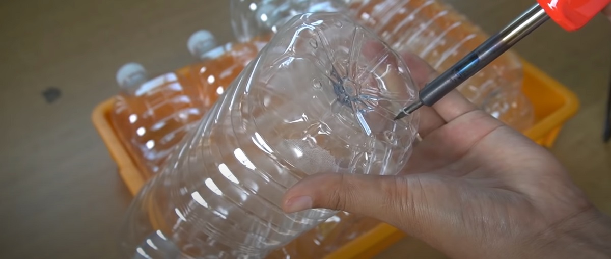 2.À l’aide du marteau à colle, percez des trous dans le fond des bouteilles pour obtenir les trous pour drainer l’eau.