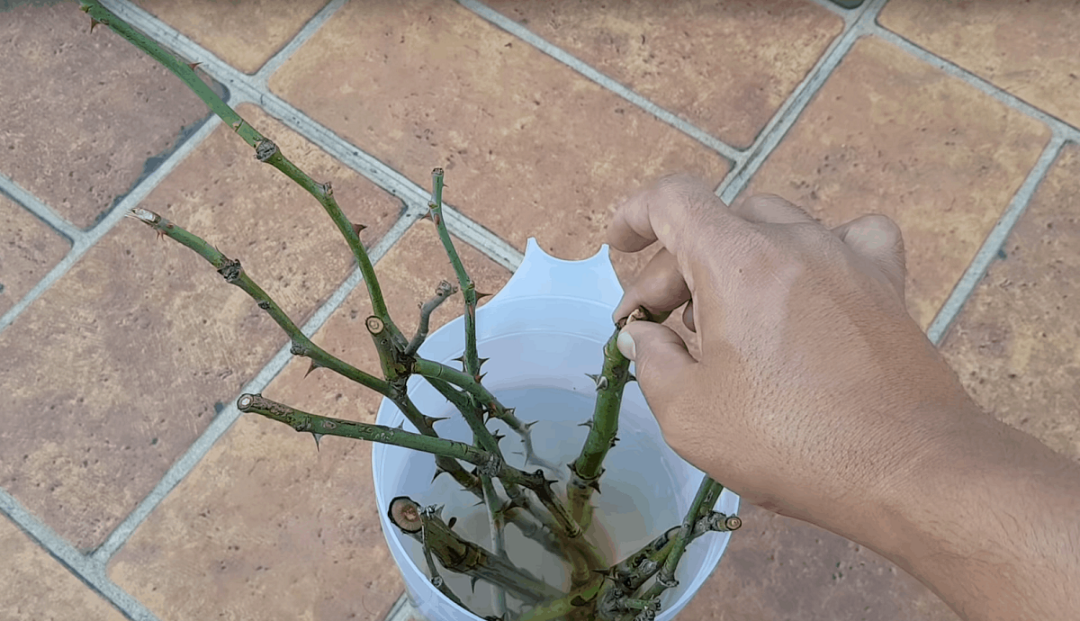 Ce sont les principes de la méthode, qui permettent d’obtenir 3-4 boutures de roses en 5 jours. Ensuite, prenez un récipient, versez-y de l’eau et plongez-y les boutures en les mettant avec des pointes vers le bas. Laissez-les dans l’eau pendant 2 jours.
