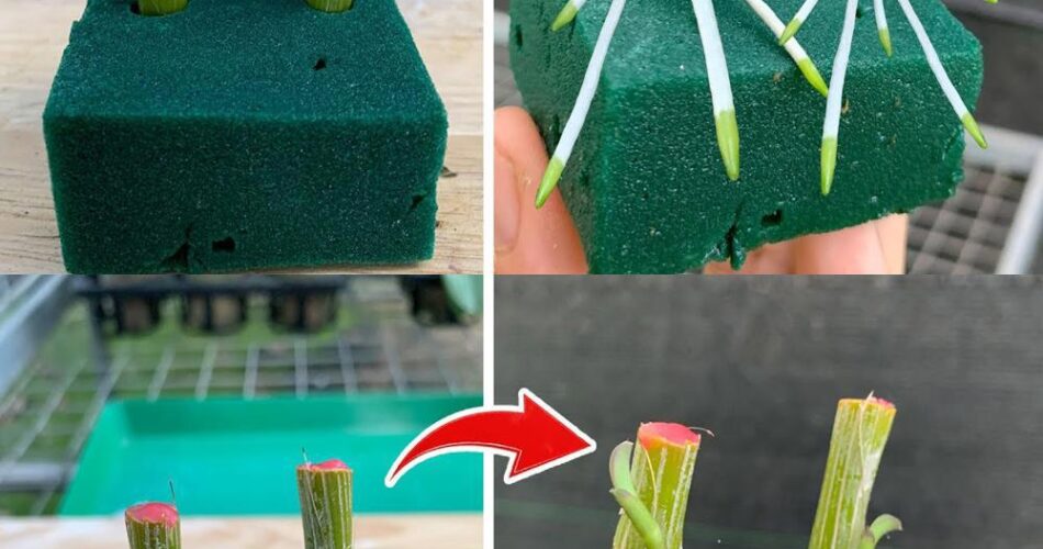 Une fois les boutures prélevées, insérez-les délicatement dans la mousse florale verte. Assurez-vous que les racines des boutures sont bien enfoncées dans la mousse pour favoriser un enracinement rapide.
