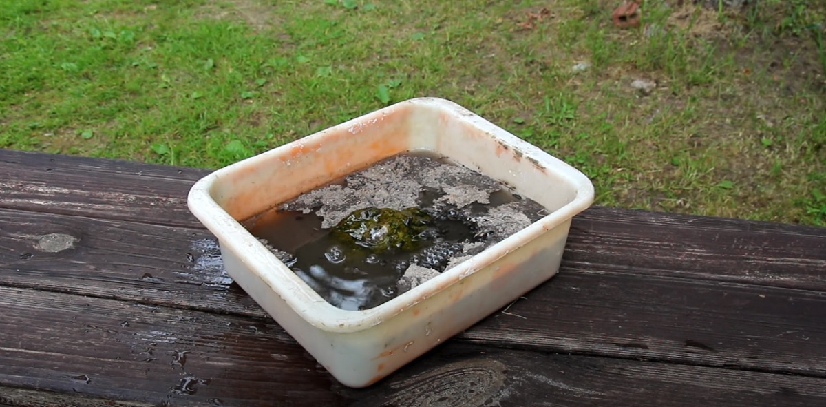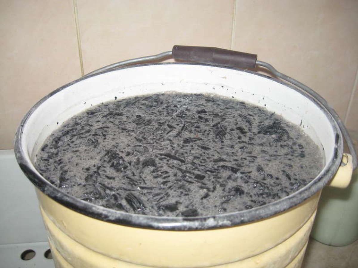 1.Versez quelques litres d’eau dans une bassine ou un seau. Ajoutez-y de la cendre de bois et un peu de savon liquide. Remuez très bien.