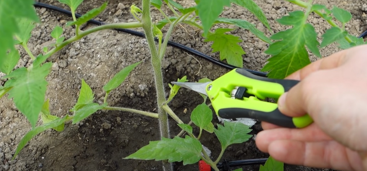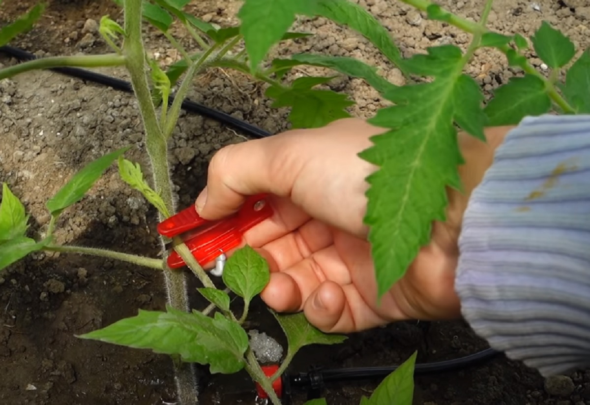 Et si vous cultivez des variétés indéterminées (hautes) de tomates, répétez l’enlèvement des feuilles inférieures au fur et à mesure que les buissons grandissent (2 feuilles toutes les 2-3 semaines) : après la taille, chaque buisson doit avoir au moins 5 feuilles, voire de préférence 8 feuilles.