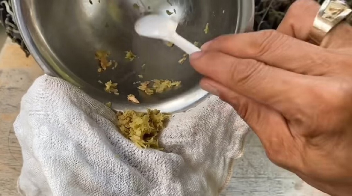 Transférez la composition obtenue sur un morceau de gaze et pressez-en très bien le jus de gingembre. Vous obtiendrez environ une cuillère à soupe de jus. Ce montant est suffisant.