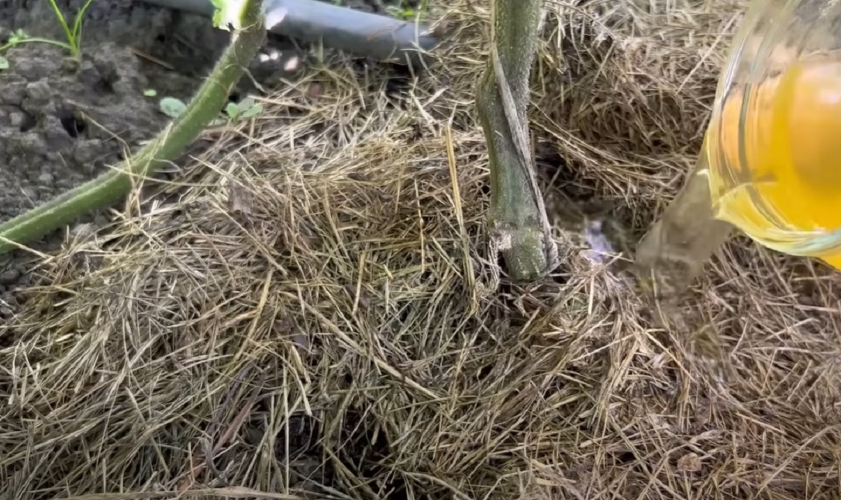 3.Versez 500 ml de thé dilué à la base de chaque buisson de concombre.
