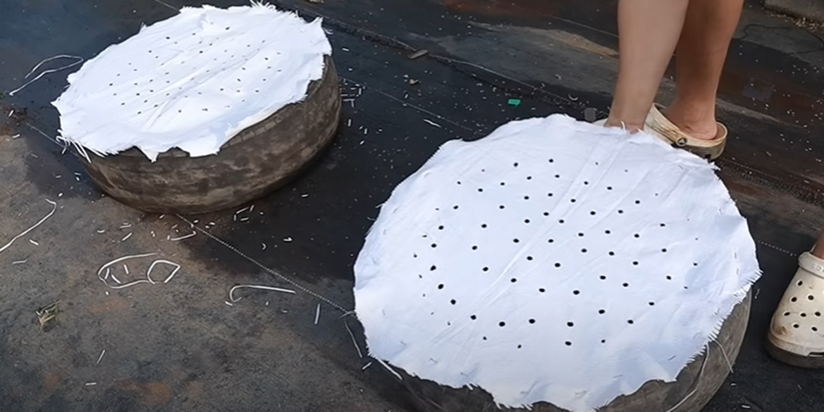1. Tapisser la base de chaque caoutchouc de sacs et y faire des trous de drainage.