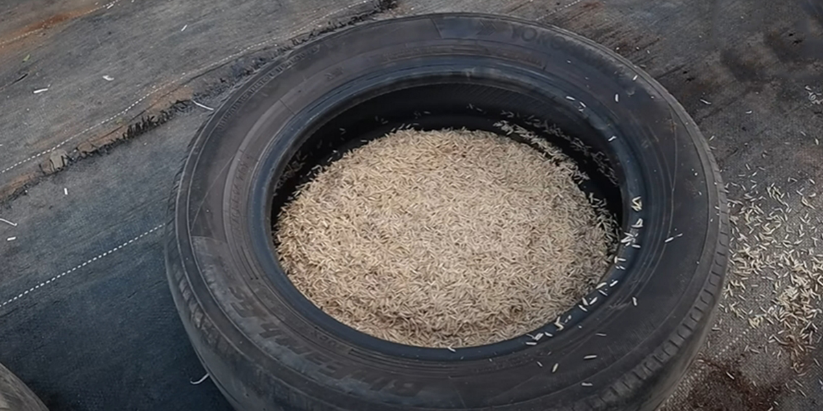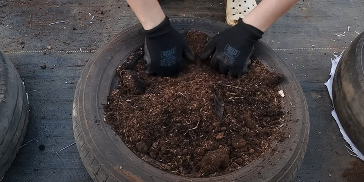 2. Remplissez les pneus avec du substrat. Nous avons opté pour des balles de riz à la base et un sol meuble.