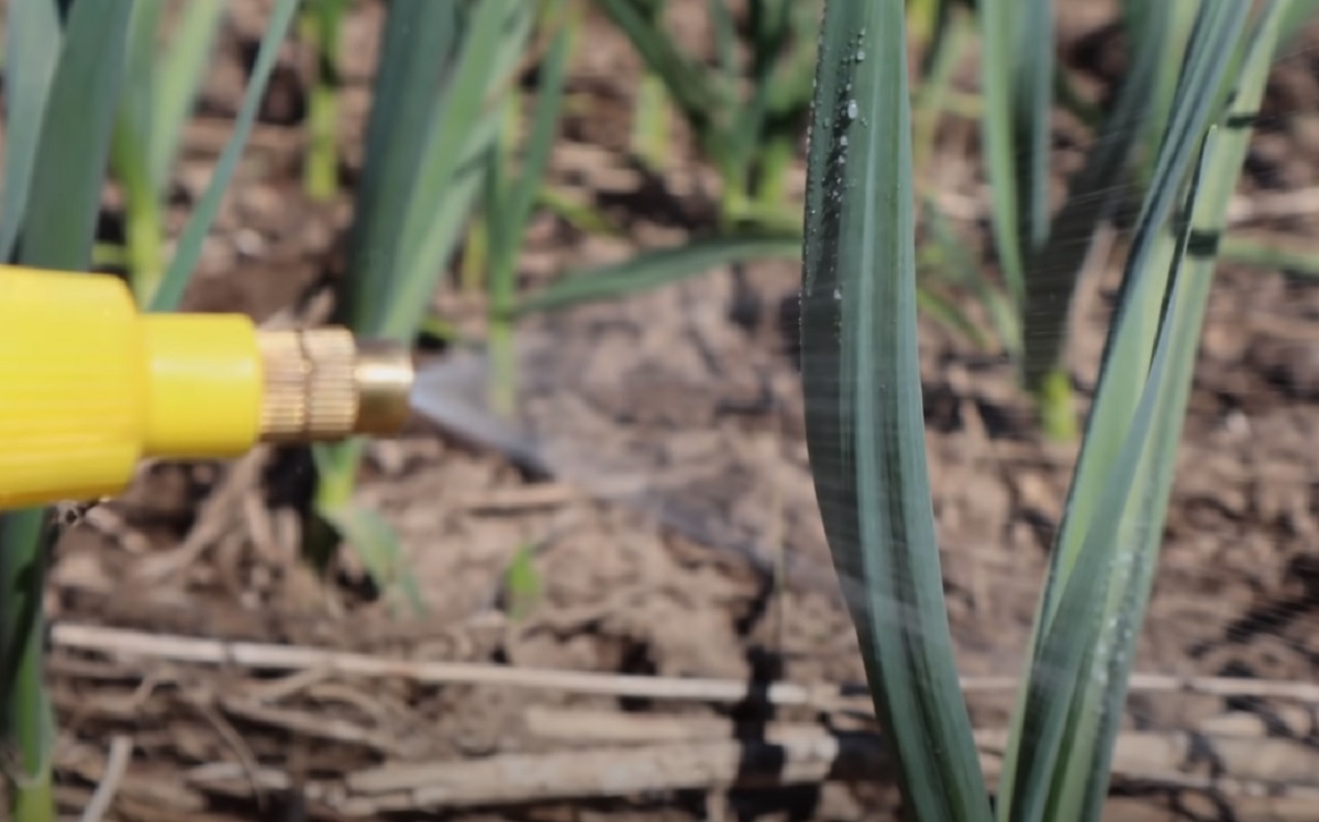 2.Appliquez la solution sur les queues d’oignon et d’ail à l’aide d’un pulvérisateur. Vous devez le faire tôt le matin ou le soir.