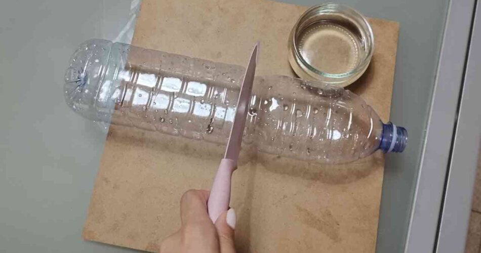 Commençons tout de suite. A l’aide d’un couteau, coupez votre bouteille en plastique en deux . Retirez le capuchon et insérez la plus petite partie, à l’envers, dans la plus grande.