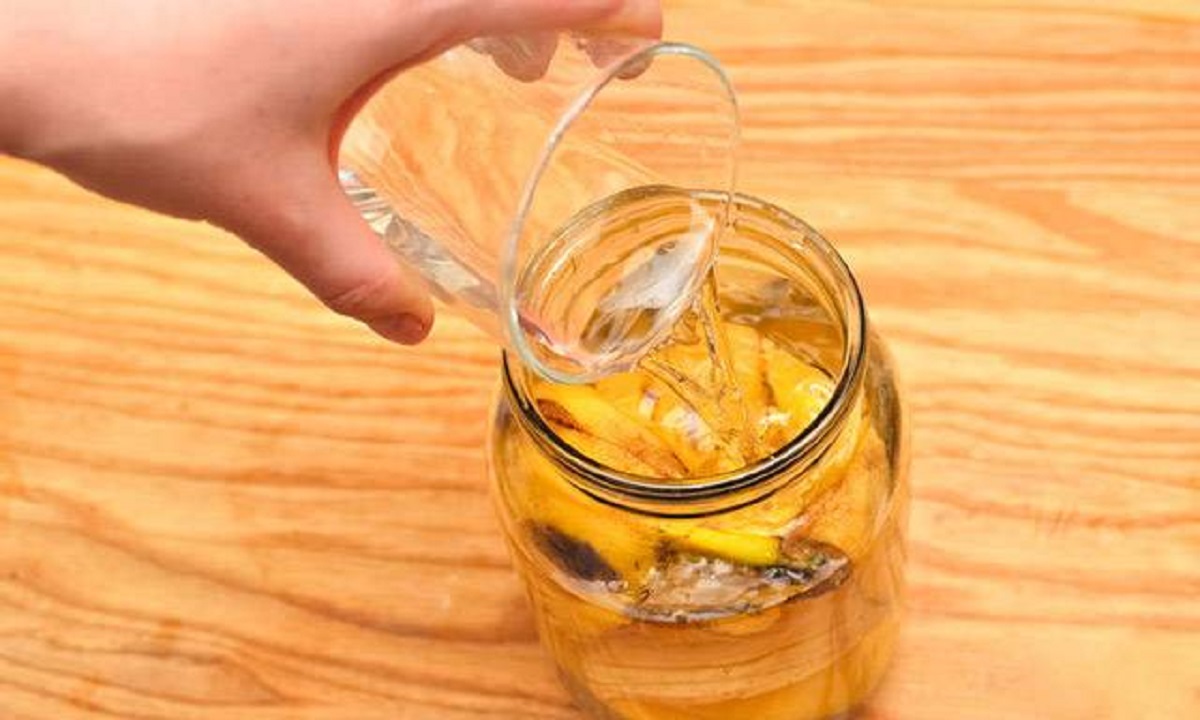 2.Mettez les peaux de banane dans un bocal de 1 litre. Versez une solution d’acide borique dessus.