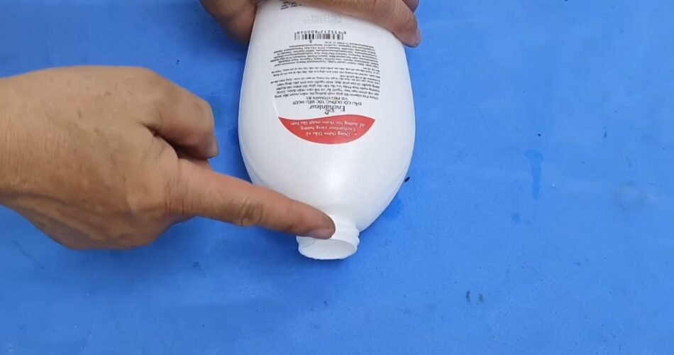 Nous recouvrons l’autre extrémité du petit morceau de tuyau avec de la colle et l’insérons bien dans un boulon, comme vous pouvez le voir clairement dans la vidéo. L’étape suivante consiste à couper un morceau du distributeur de shampoing . Dans la partie restante, nous allons insérer un petit tube en plastique pour voir s’il s’insère correctement.
