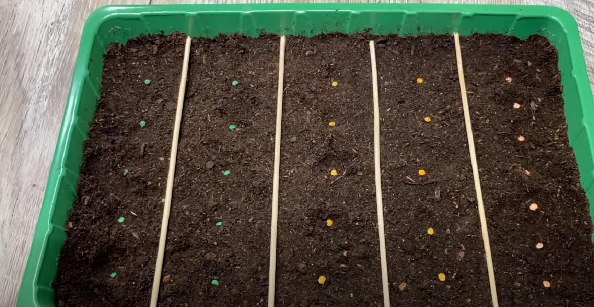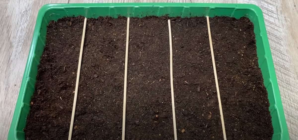 2.Délimitez les rangées avec des brochettes en bois : la distance entre elles doit être de 4 à 5 cm. Ainsi, les semis auront suffisamment d’espace pour se développer, leurs racines ne se croiseront pas et vous pourrez éviter l’apparition de la maladie des jambes noires, car les semis ne seront pas trop souvent.