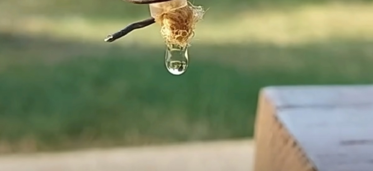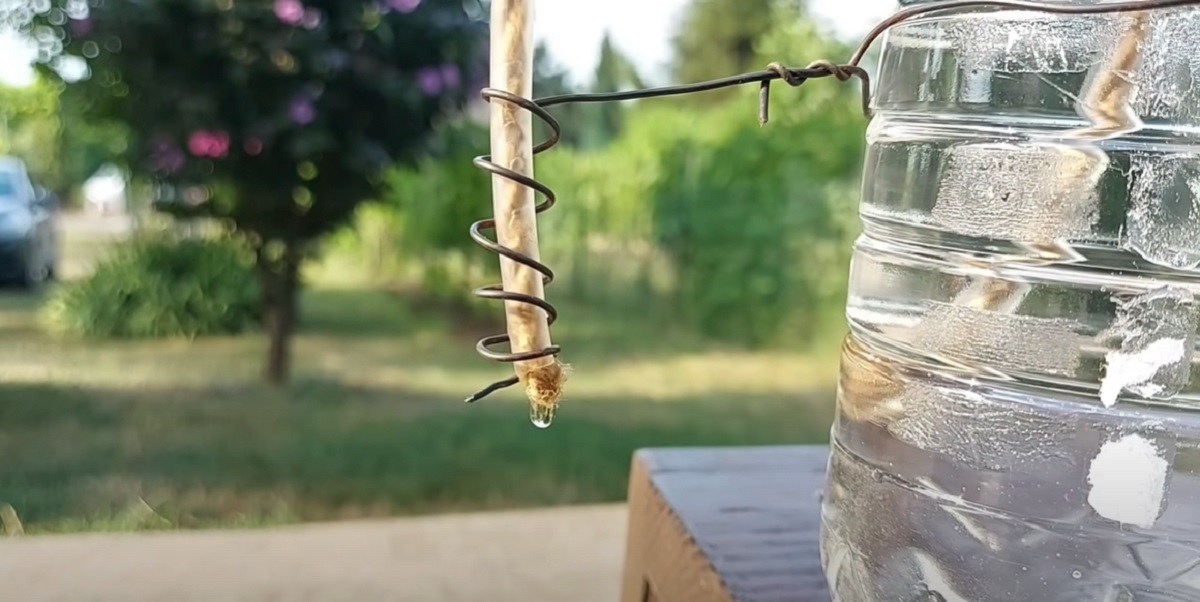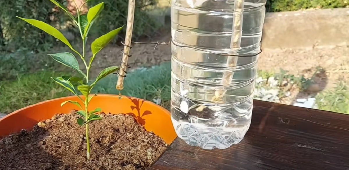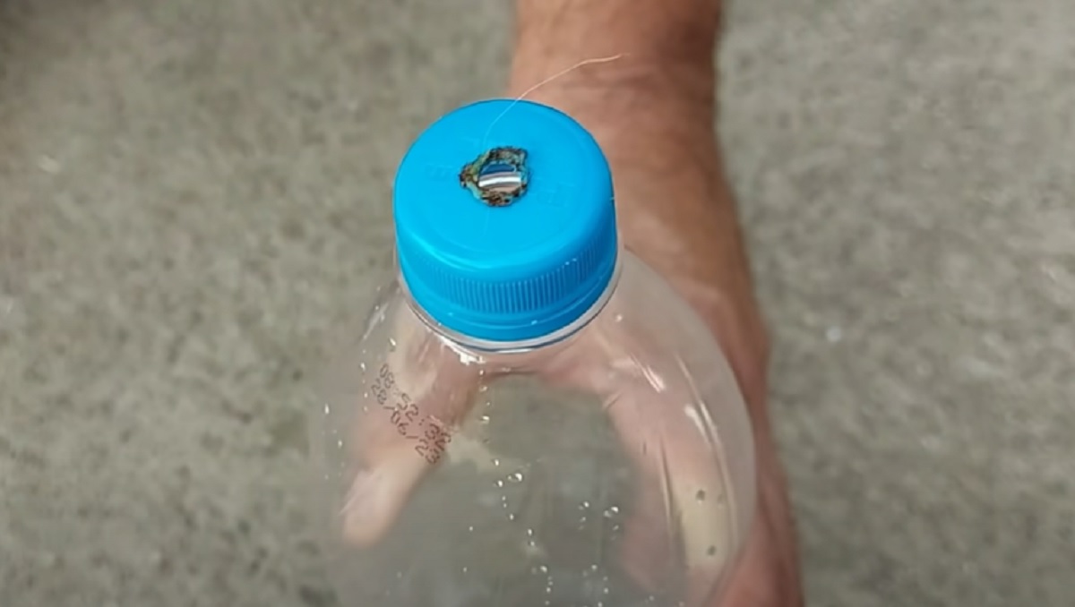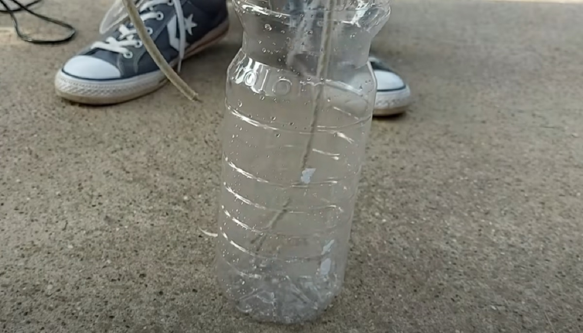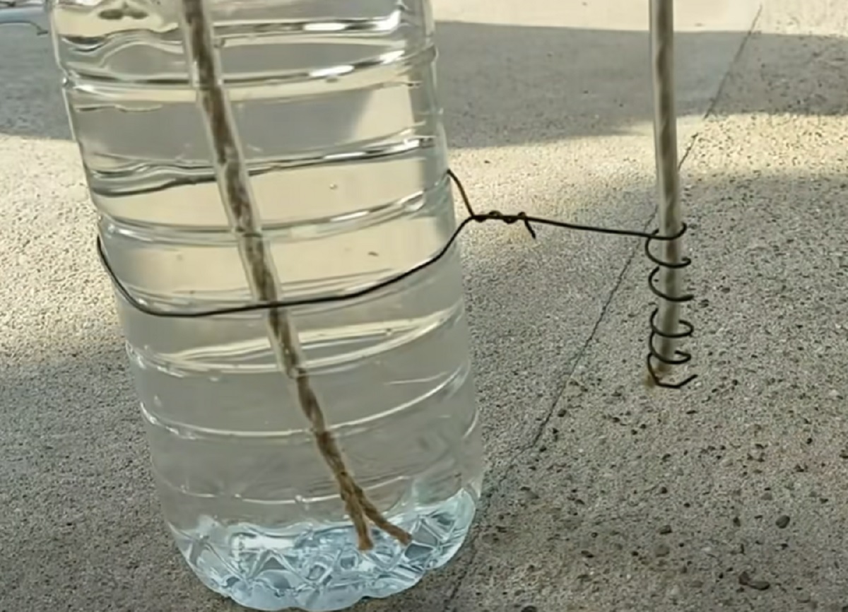 7.Retournez la bouteille en plastique et appuyez dessus un peu à la fois pour mouiller la corde du tuyau. Après cela, le système d’irrigation goutte à goutte sera prêt !