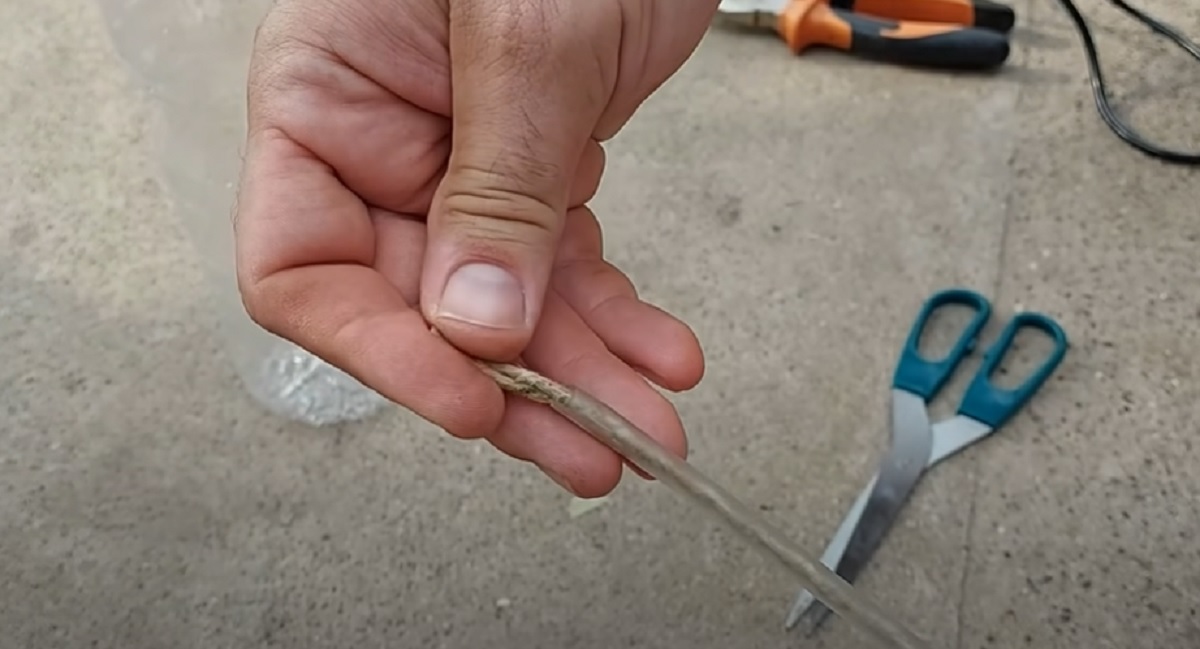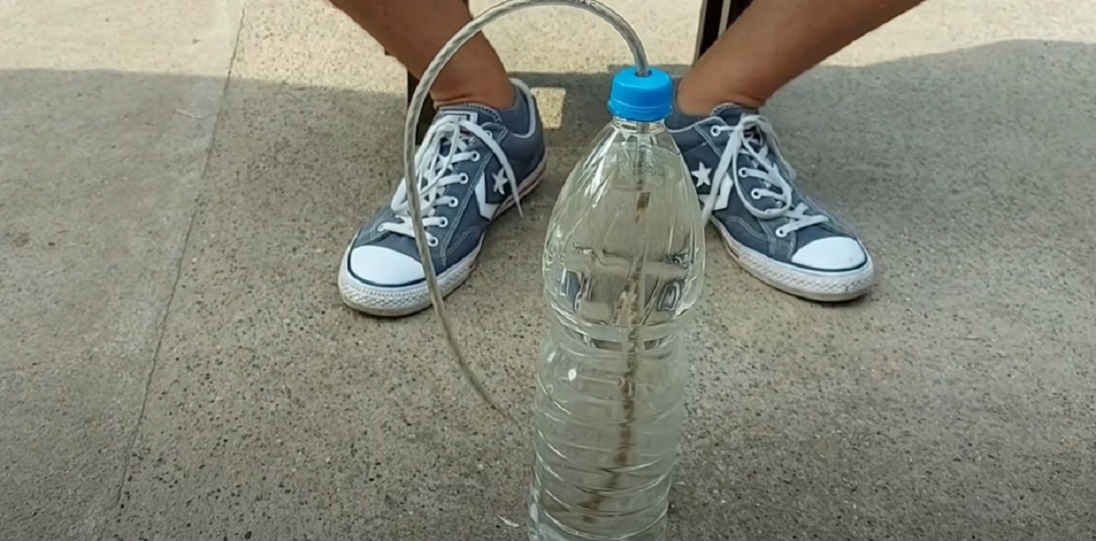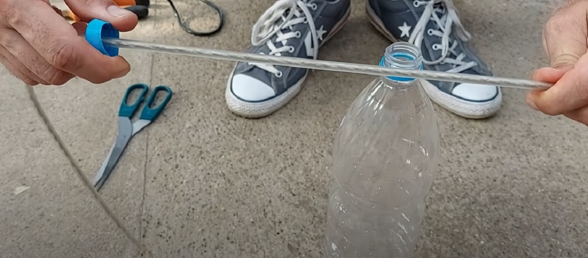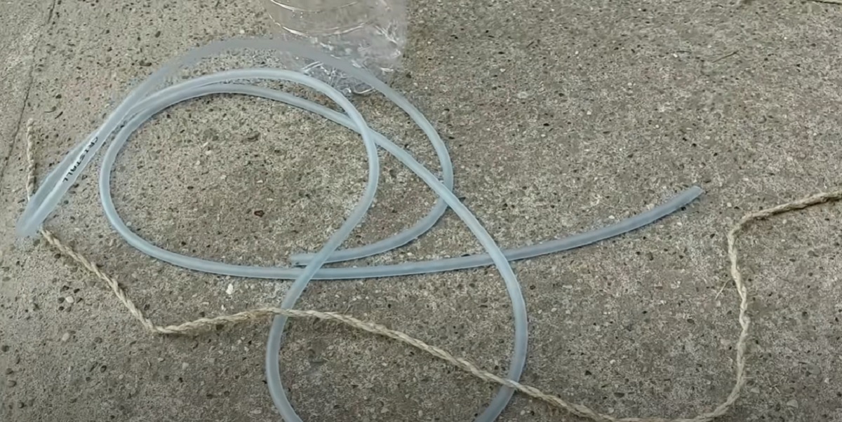 2.Préparez le tuyau et la corde, dont la longueur doit être presque égale à deux fois la longueur de la bouteille – la ficelle doit être légèrement plus longue que le tuyau et doit pouvoir y pénétrer. Par la suite, une extrémité du tuyau sera positionnée près du fond de la bouteille, et l’autre pendra au-dessus du sol.