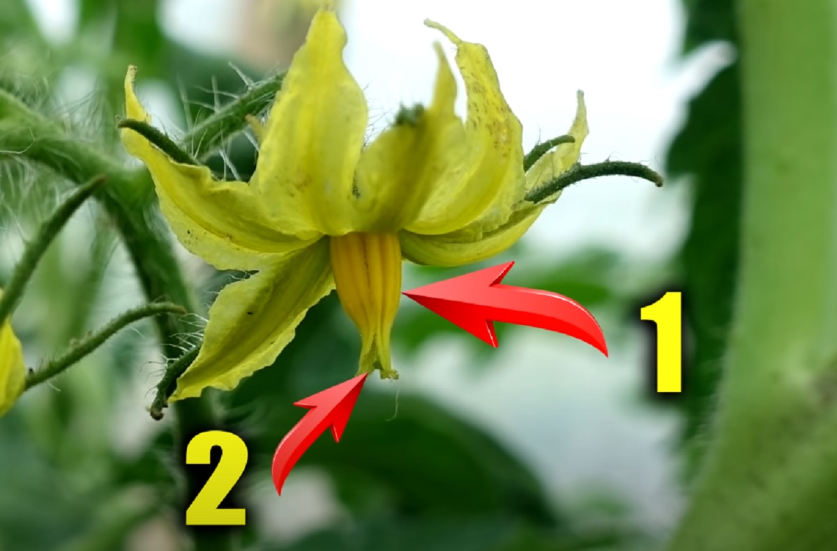 Sur l’image ci-dessous sont montrées les étamines d’une fleur de tomate, qui ont fusionné sous la forme d’un cône (1), et les stigmates du pistil, qui sont situés à l’intérieur (2).