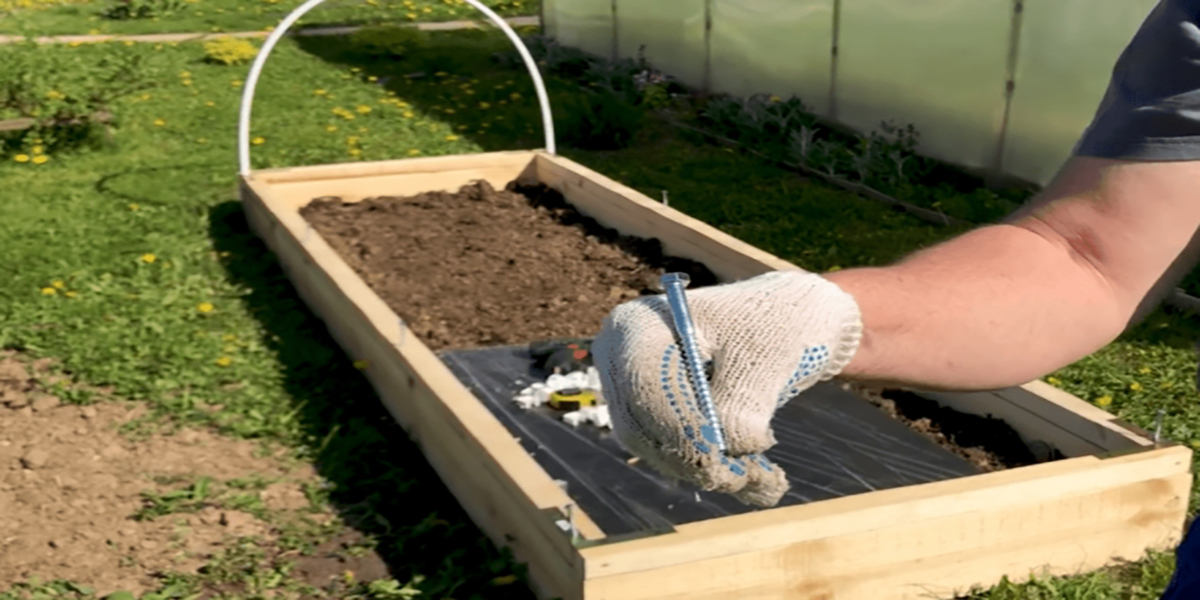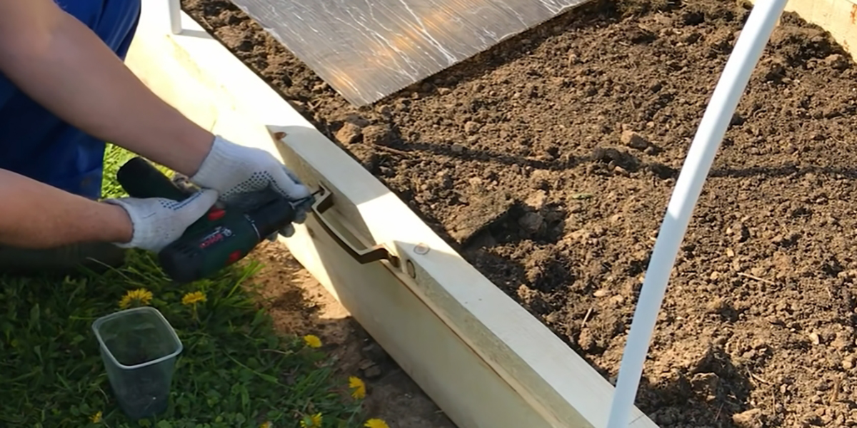 Assemblez le boîtier supérieur à partir de planches de 50 ×à 300 cm et fixez-les sur les côtés avec de longues vis (100 mm). Si vous ne prévoyez pas de déplacer la serre avec le temps, vous pouvez insérer et fixer le périmètre du logement avec de petits morceaux de renfort, qui le maintiendront immobile.