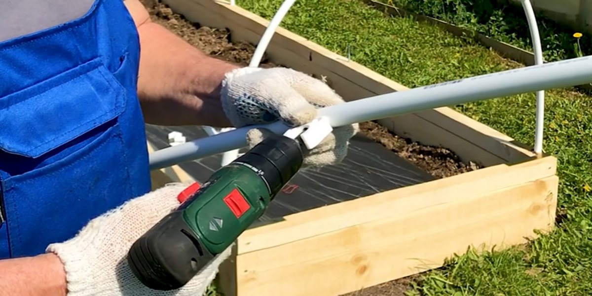 Installez trois connecteurs chacun sur les arcs extérieurs et remplissez les deux autres avec des supports afin que les tuyaux courent le long des ressorts. De cette façon, vous serez en mesure d’éviter des complications inutiles lors de la couverture et d’autres opérations subséquentes. Pour éviter que les fixations ne se déplacent avec le temps, fixez-les en plus avec des vis autoperceuses.