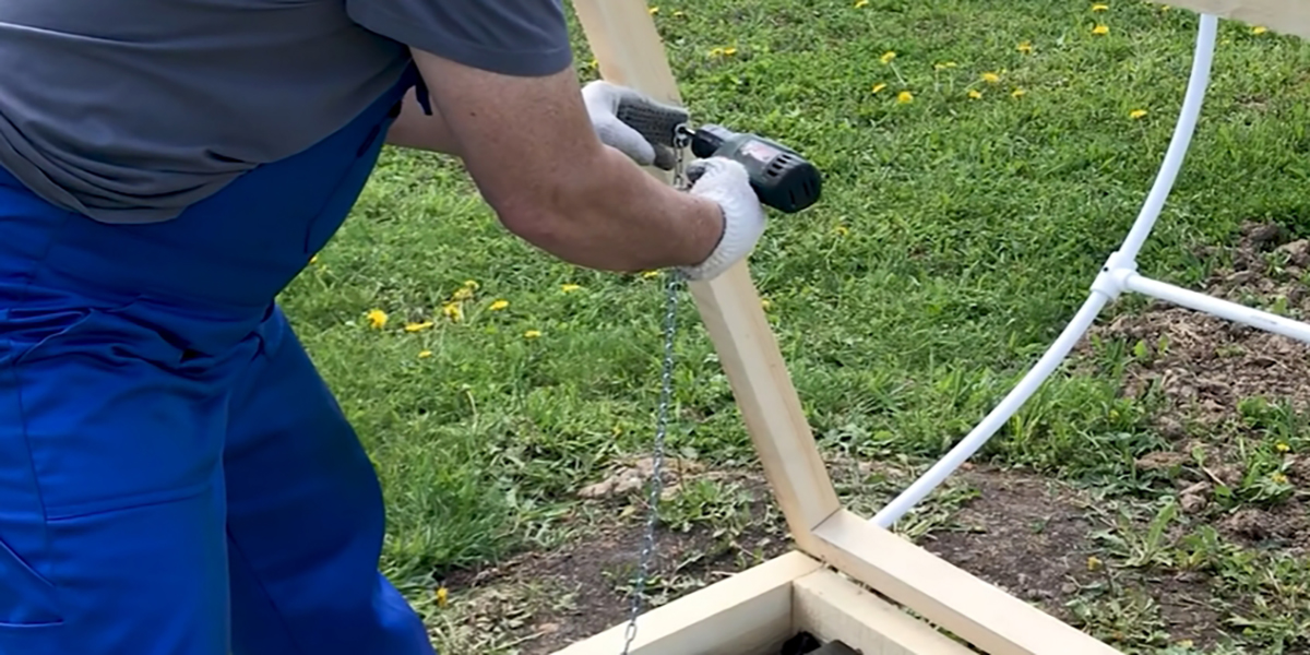 Fixez des chaînes de fixation sur les côtés pour maintenir le dôme en place. Calculez leur longueur de manière à ce que lorsque vous l’ouvrez, il ne touche pas le sol. Aujourd’hui, le cadre est complet.