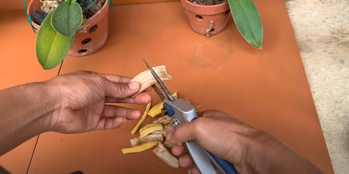 1. Étape 1 : Pour commencer, coupez la tige à l’extrémité de la tige florale et graissez la coupe avec du dentifrice. Épluchez ensuite 2 bananes et coupez les pelures en morceaux de taille moyenne.