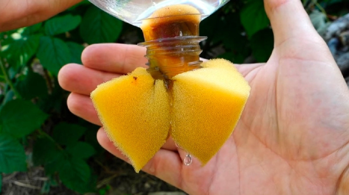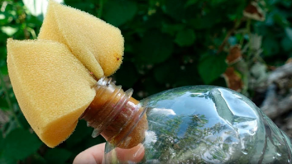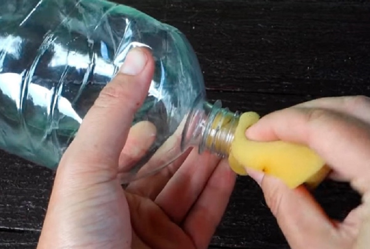 Coupez le fond d’une bouteille en plastique. Mettez un morceau d’éponge, plié en deux, à la place du bouchon.